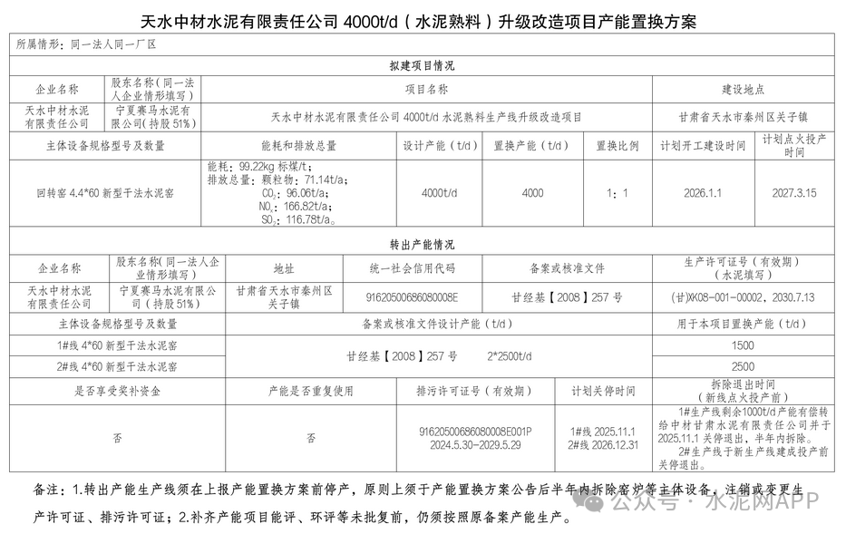置换方案显示,天水中材水泥拟升级改造建设一条4000t/d熟料生产线,退出产能来自同企业2*2500t/d生产线,置换比例1:1,剩余1000t/d产能有偿转给中材甘肃水泥。该项目计划2026年1月1日开工建设,2027年3月15日点火投产。