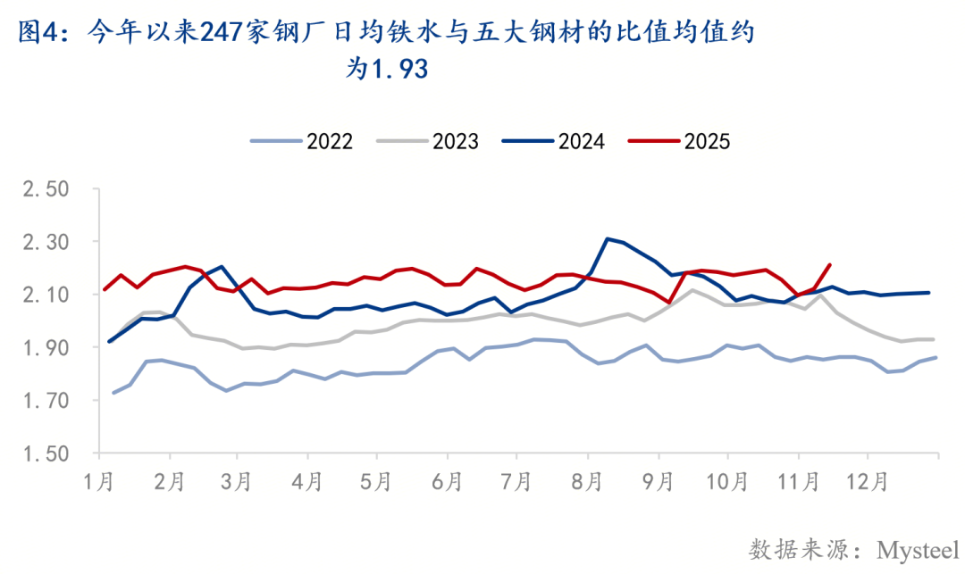 钢市负反馈的最终目的在于倒逼钢厂减产,以此缓解供应边际过剩所带来的钢材库存去化乏力的压力,那么减产需减到何种程度,才能缓解这种压力呢?产量端,我们通过锚定Mysteel247家日均铁水产量,以此作为评估减产程度的最终指标。首先,由于五大钢材产量与247家日均铁水产量之间存在一定的换算关系:1、两个指标存在一定的趋势相关性(如下图3);2、今年以来两者之间的比值均值约为1.93(如下图4)。因此,根据上述两个指标之间的关系,便可推导出247家日均铁水产量最终需减至何种水平,来达到钢材库存去化的平衡状态。