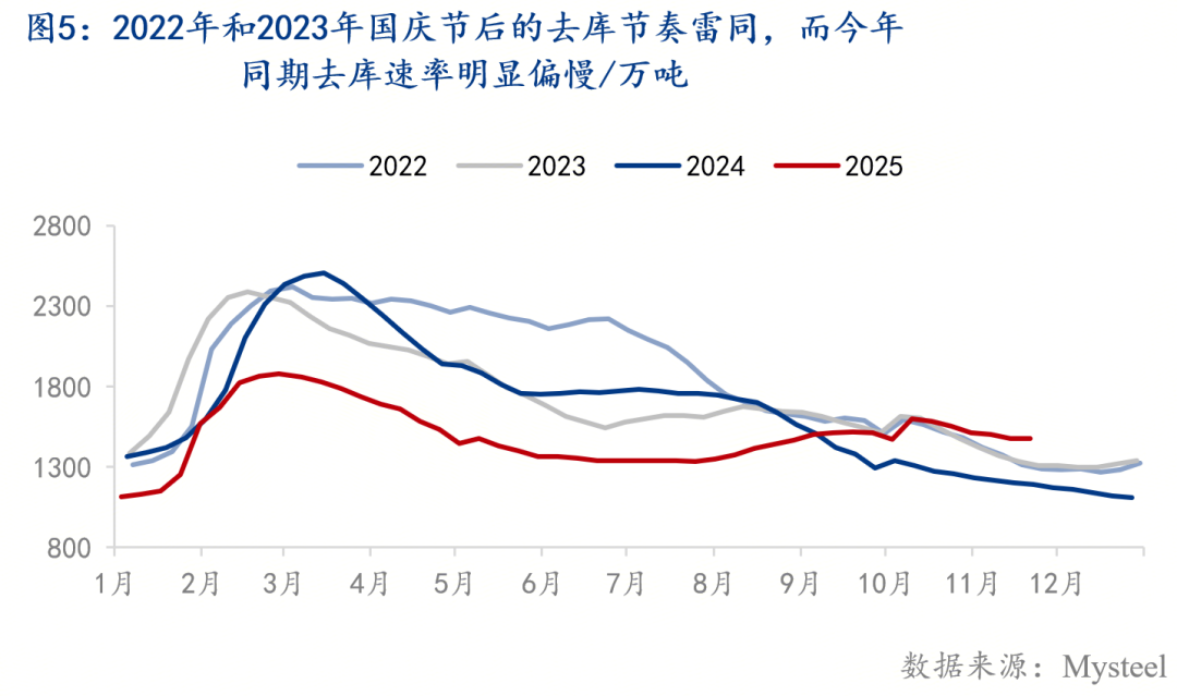 由于今年国庆节后,五大钢材总库存高点与2022年、2023年的同期水平相当,且2022年和2023年国庆节后的五大钢材去库节奏雷同(如下图5),因此我们通过锚定这两年国庆节后的去库节奏,来判断今年国庆节后五大钢材去库是否健康。