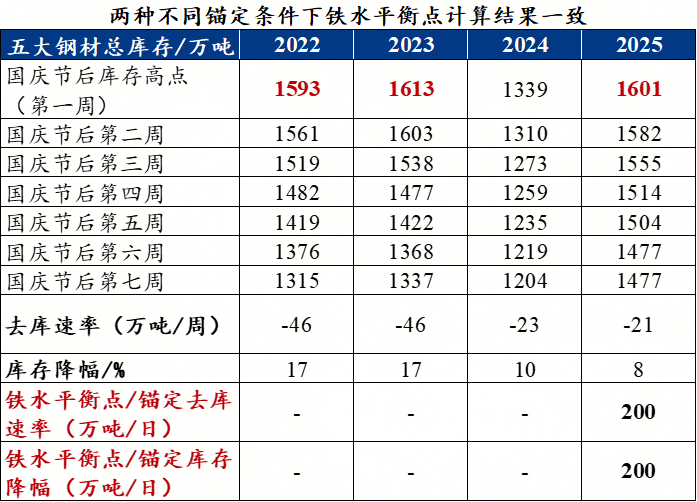 首先,从库存去库速率的角度来看:经过计算,今年国庆节后五大钢材总库存从高点1601万吨降至当前水平1477万吨的过程中,其去库速率为21万吨/周;然而,2022年同期去库速率为46万吨/周,2023年同样为46万吨/周,因此这两年的去库速率均值在46万吨/周。可以看到今年国庆节后的去库速率要少了26万吨/周,也就说五大钢材产量相比需求要多出了22万吨/周;若想要今年国庆节后的去库速率与2022年、2023年的去库速率均值相当,那么通过推算得出,铁水产量需要从国庆后的高点242万吨/日降至约200万吨/日附近,才能够实现去库速率的趋同。其次,若从去库降幅的角度来看:今年国庆节后五大钢材总库存从高点1601万吨降至当前水平1477万吨的过程中,其降幅为8%;然而,2022年同期降幅为17%,2023年同期降幅为17%,因此这两年的库存降幅均值为17%。很显然,今年的库存降幅明显要低于2022年和2023年的同期水平。若锚定这两年的降幅均值17%,那么经过计算,国庆节后相同的去库时间内,今年五大钢材总库存要少去库了约153万吨,也就说五大钢材产量相比需求要多出了153万吨。若把多出来的153万吨转换成铁水产量,那么铁水产量需要从国庆后的高点242万吨/日同样降至约200万吨/日附近。在两种不同的锚定条件下,铁水平衡点计算的结果却是一样的,核心原因在于今年与2022年、2023年国庆节后的库存高点水平相近。同时,对于当前236万吨/日的日均铁水而言,理论上仍将有约36万吨的减产空间。