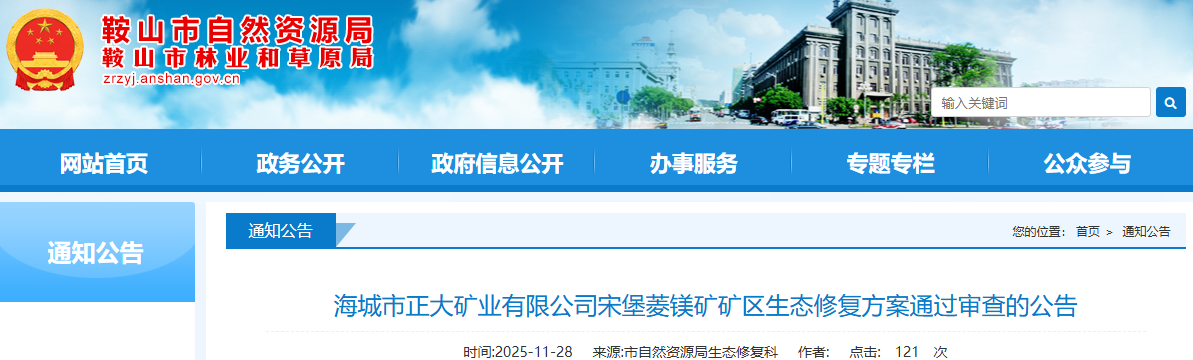 根据《辽宁省自然资源厅关于〈中华人民共和国矿产资源法〉实施衘接过渡期矿区生态修复方案评审工作的公告》、《辽宁省自然资源厅关于印发<矿山地质环境保护与土地复垦方案省级审查管理办法(试行)>的通知》(辽自然资发〔2022〕129号)有关要求,《海城市正大矿业有限公司宋堡菱镁矿矿区生态修复方案》通过审查,现予公告。