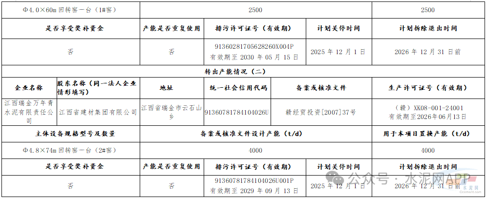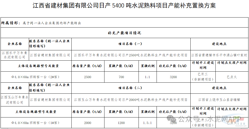 公示内容显示,江西省建材集团有限公司拟将下属成员企业江西乐平万年青水泥有限公司1#窑2500t/d水泥熟料产能,用于江西乐平万年青水泥有限公司、江西玉山万年青水泥有限公司两家企业2条水泥熟料生产线进行补充产能,置换比例分别为1︰1和1.5︰1,分别补充江西乐平万年青水泥有限公司2#窑700t/d水泥熟料产能、江西玉山万年青水泥有限公司1#窑1200t/d水泥熟料产能;