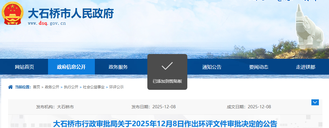 根据建设项目环境影响评价审批程序的有关规定,经审查,我局对1个项目环境影响评价文件作出审批决定。现将作出的审批决定情况予以公告,公告期为2025年12月8日-2025年12月12日(5个工作日)。