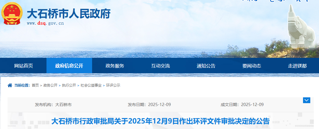 根据建设项目环境影响评价审批程序的有关规定,经审查,我局对1个项目环境影响评价文件作出审批决定。现将作出的审批决定情况予以公告,公告期为2025年12月9日-2025年12月15日(5个工作日)。