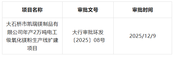 附件:关于大石桥市凯瑞镁制品有限公司年产2万吨电工级氧化镁粉生产线扩建项目环境影响报告表的批复