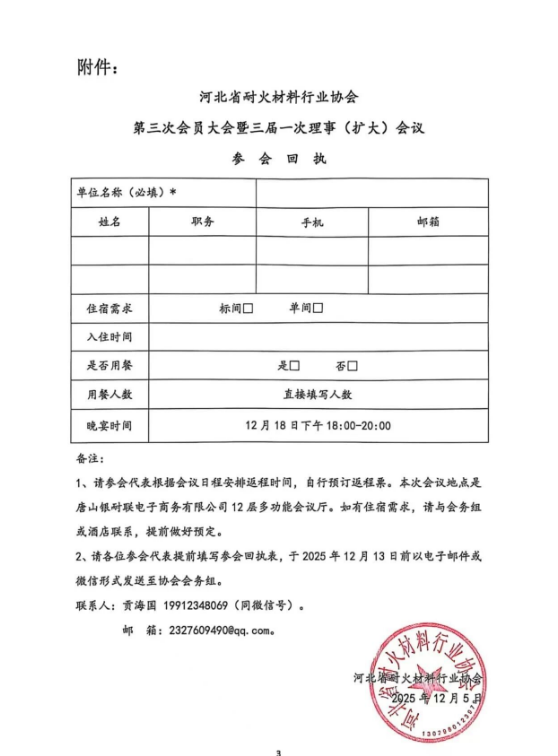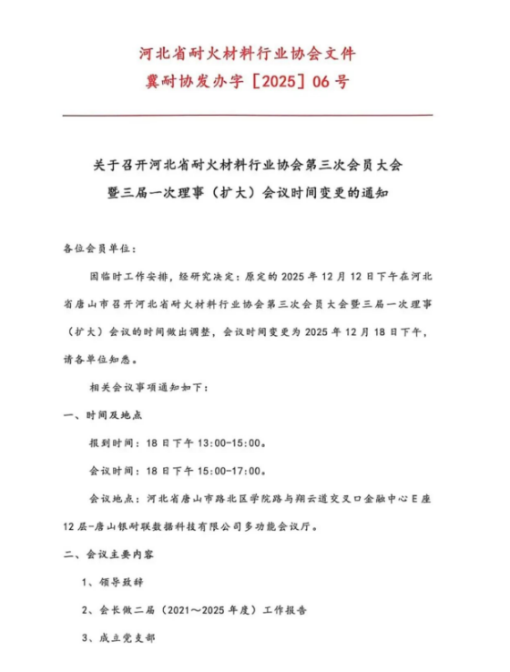 关于召开河北省耐火材料行业协会第三次会员大会暨三届一次理事(扩大)会议时间变更的通知