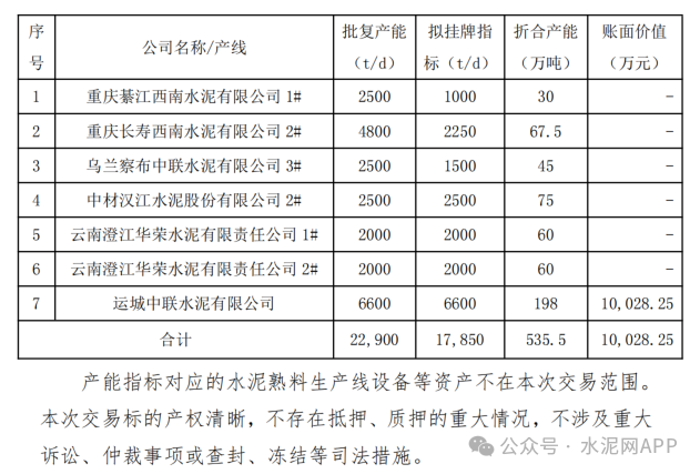 12月12日晚,天山股份发布公告称,为最大程度发挥现有产能价值,结合生产线实际情况,公司所属子公司拟将下属7条水泥熟料生产线的产能指标以公开挂牌方式进行转让,拟挂牌的产能指标合计17,850t/d,折合535.5万吨,转让金额合计约29,752.65 万元。