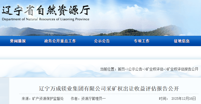 按照《关于完善矿业权出让收益评估程序的通知》(辽自然资办发[2022]2号)要求,《辽宁万成镁业集团有限公司采矿权出让收益评估报告》及相关附件已在省自然资源厅公示10个工作日,无异议,予以公开。
