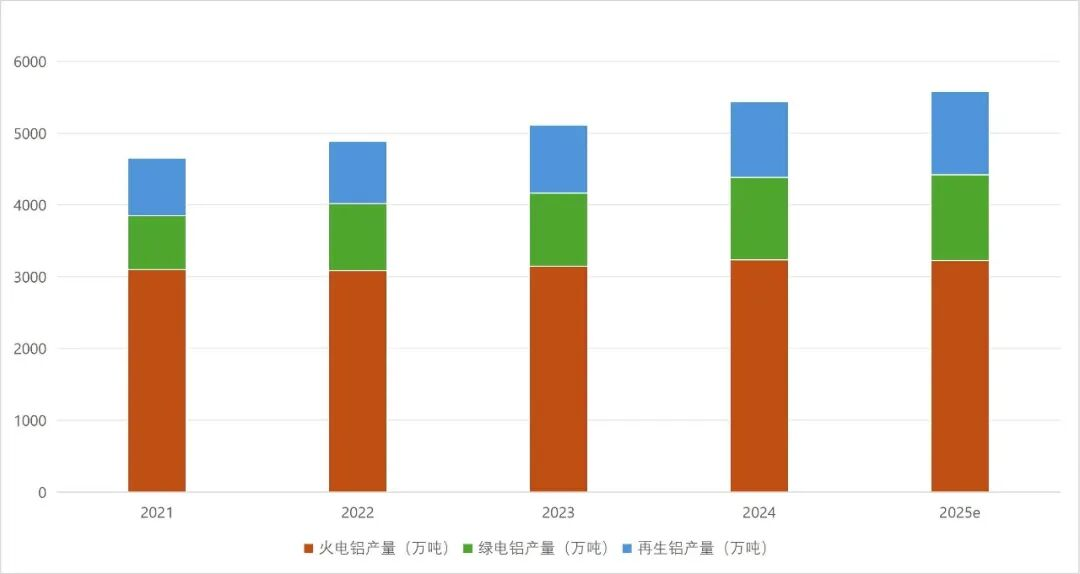 “十四五”期间,绿电铝、再生铝、火电铝产量比重增长趋势图