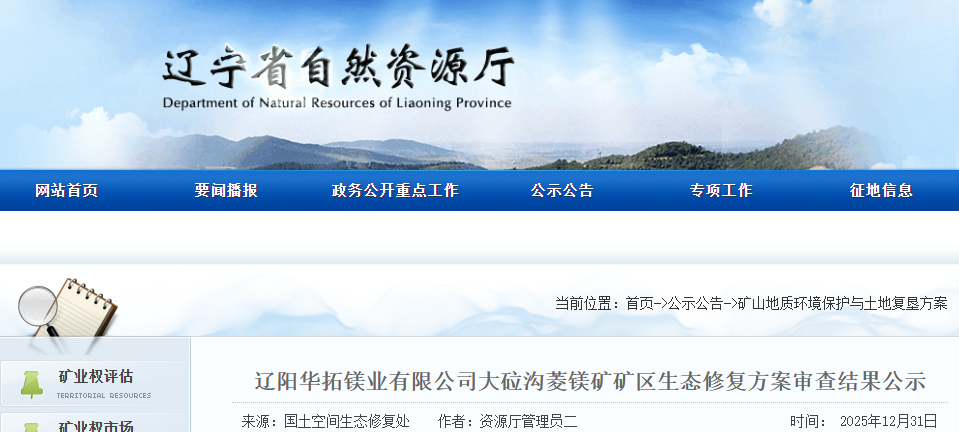 根据《土地复垦条例》和《辽宁省地质环境保护条例》有关要求,我厅委托自然资源事务服务中心组织专家对《辽阳华拓镁业有限公司大砬沟菱镁矿矿区生态修复方案》进行了审查。现将拟同意通过的该方案及专家评审意见进行公示,公示期自发布之日起5个工作日。