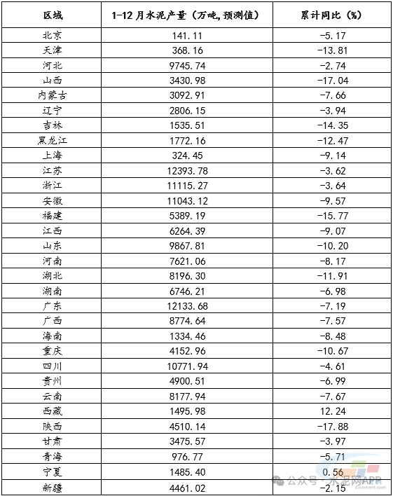 1-12月,31个省(市)中,水泥产量增长和下降的省(市)预计分别有2个和29个。