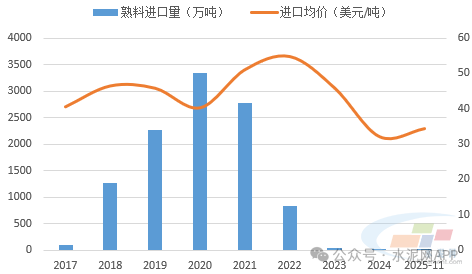 2025年1-11月,我国进口熟料量仅有4.92万吨,持续维持低位水平,这或与今年下游需求萎靡、厂家熟料库位高企有关。进口价格方面,1-11月熟料进口均价34.37美元/吨,同比上涨6.17%。