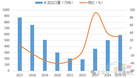 我国水泥出口量较少,主要以满足国内需求为主。2025年1-11月份,出口水泥591.4万吨,同比增长29%,尽管增长幅度较大,但绝对量相对国内产量来说仍偏低。