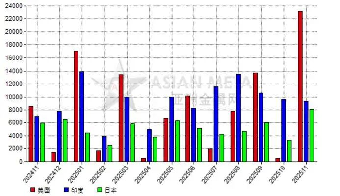 2025年11月,中国电熔镁砂前三大出口目的国为美国、印度和日本。