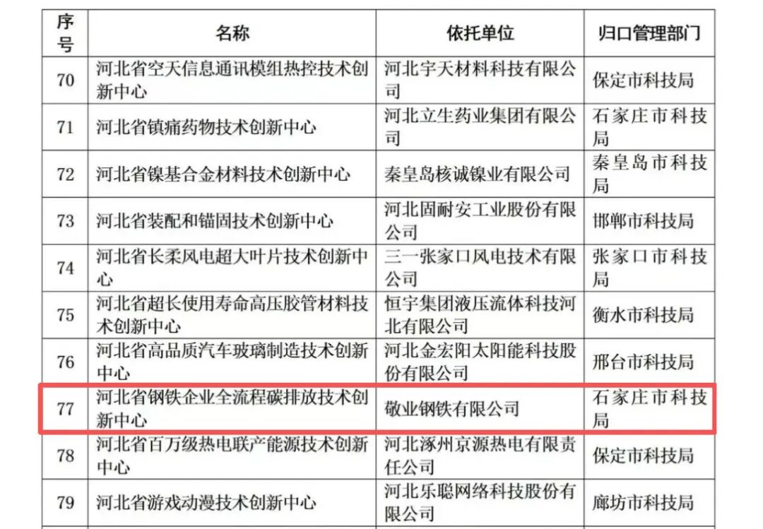 近日,河北省科学技术厅公布了2025年新建省技术创新中心名单。由敬业钢铁有限公司作为依托单位的“河北省钢铁企业全流程碳排放技术创新中心”成功获批。