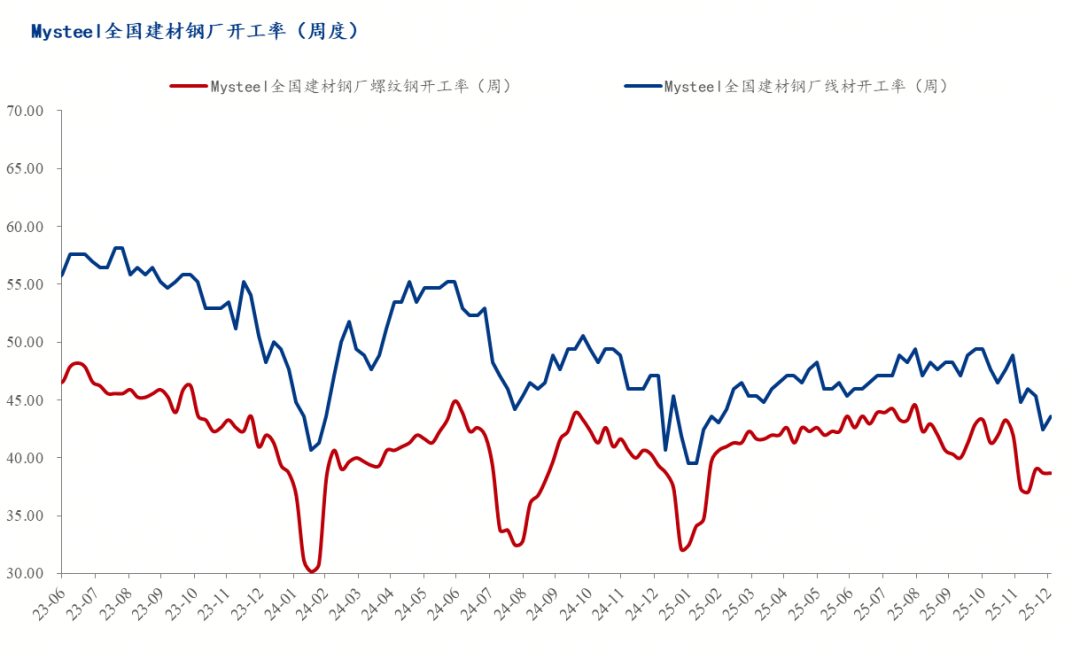 截止12月底,全国建筑钢材钢厂螺纹钢和线材开工率环比均有一定下降。12月25日,螺纹钢开工率为38.56%,较上月下降3.27个百分点,线材开工率42.44%,较上月下降6.4个百分点。分工艺来看,长流程企业螺纹钢开工率环比下降3.65个百分点,长流程线材开工率下降6.71个百分点;短流程螺纹钢开工率环比下降2.35个百分点,短流程线材开工率环比下降4.76个百分点。