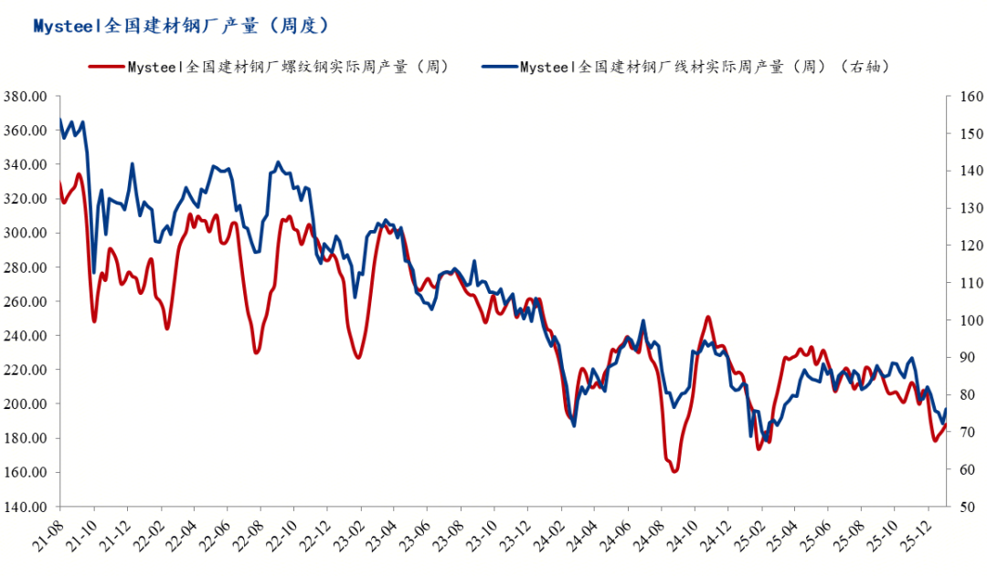 二、建筑钢材开工率、产量环比继续下降