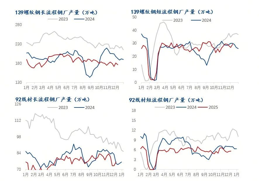 截止12月25日,螺纹钢周产量为184.39万吨,月环比下降21.7万吨,年同比下降31.92万吨;线材周产量为72.33万吨,月环比下降9.84万吨,年同比下降10.56万吨。分工艺来看,长流程企业螺纹钢产量环比下降21.76万吨,线材产量环比下降9.74万吨;短流程企业螺纹钢产量环比增加0.07万吨,线材产量月环比下降0.11万吨。