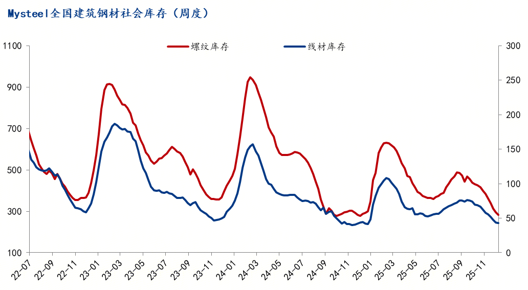 截止12月26日,统计螺纹钢社会库存294.19万吨,月环比下降90.56万吨,年同比增加15.98万吨;线材库存43.70万吨,月环比下降14.08万吨,年同比下降0.26万吨。