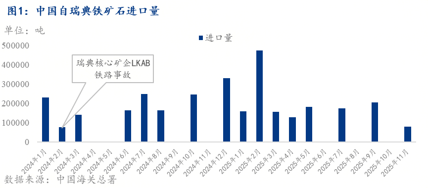 中国海关数据显示,2025年中国自瑞典进口铁矿石数量较2024年同期明显回升。2025年1-11月中国自瑞典铁矿石进口量为156万吨,同比增长22.8%,但从绝对量水平看,该阶段的进口规模仍低于2023年同期的180.1万吨,整体尚未恢复至此前水平。