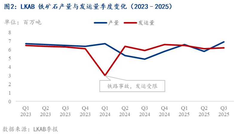 回顾2024年,LKAB在生产和运输两端均遭遇明显扰动。一方面,运输端多起铁路事故导致主干运输线路中断,铁矿石外运能力阶段性受限;另一方面,矿山端下调产量目标及计划性检修,叠加影响下,全年铁矿石产量与发运量均有所下滑。