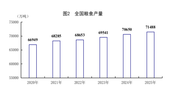 全年全国粮食总产量71488万吨,比上年增加838万吨,增长1.2%。其中,夏粮产量14975万吨,下降0.1%;早稻产量2851万吨,增长1.2%;秋粮产量53662万吨,增长1.5%。分品种看,小麦产量14007万吨,基本持平;玉米产量30124万吨,增长2.1%;稻谷产量20904万吨,增长0.7%;大豆产量2091万吨,增长1.3%。全年猪牛羊禽肉产量10072万吨,比上年增长4.2%,首次超过1亿吨。其中,猪肉产量5938万吨,增长4.1%;牛肉产量801万吨,增长2.8%;羊肉产量496万吨,下降4.2%;禽肉产量2837万吨,增长6.7%。牛奶产量4091万吨,增长0.3%;禽蛋产量3498万吨,下降2.5%。全年生猪出栏71973万头,增长2.4%;年末生猪存栏42967万头,增长0.5%。