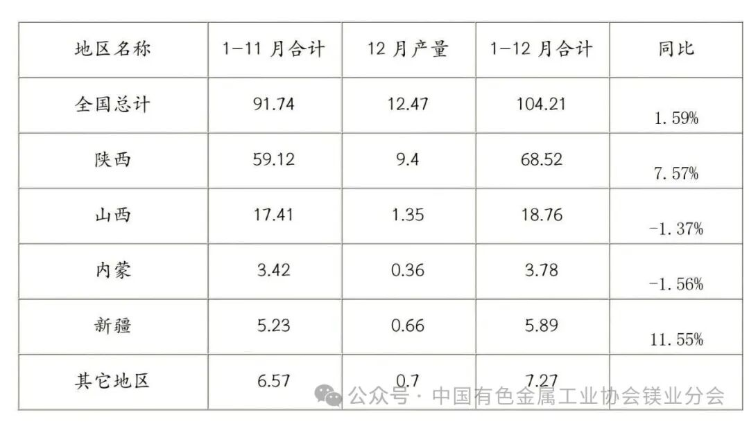 2025年1—12月中国原镁产量分地区统计情况(单位:万吨)