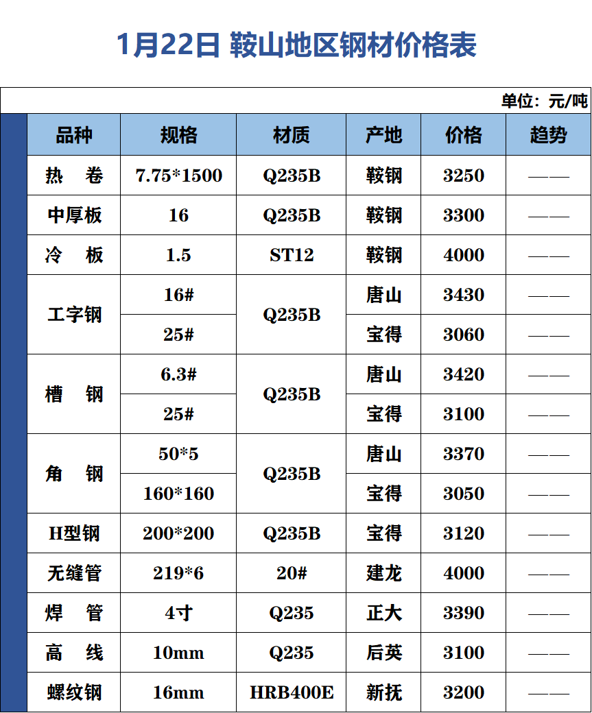 1月22日 鞍山地区钢材价格表