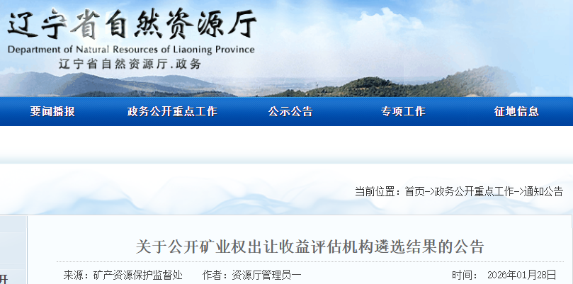 按照《辽宁省自然资源厅关于公开遴选矿业权出让收益评估机构的公告》要求,经综合评定,确定2026年省级矿业权出让收益评估机构入围名单如下,特此公告。