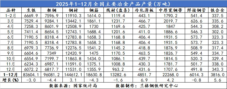 表1 2025年1-12月全国主要冶金产品产量