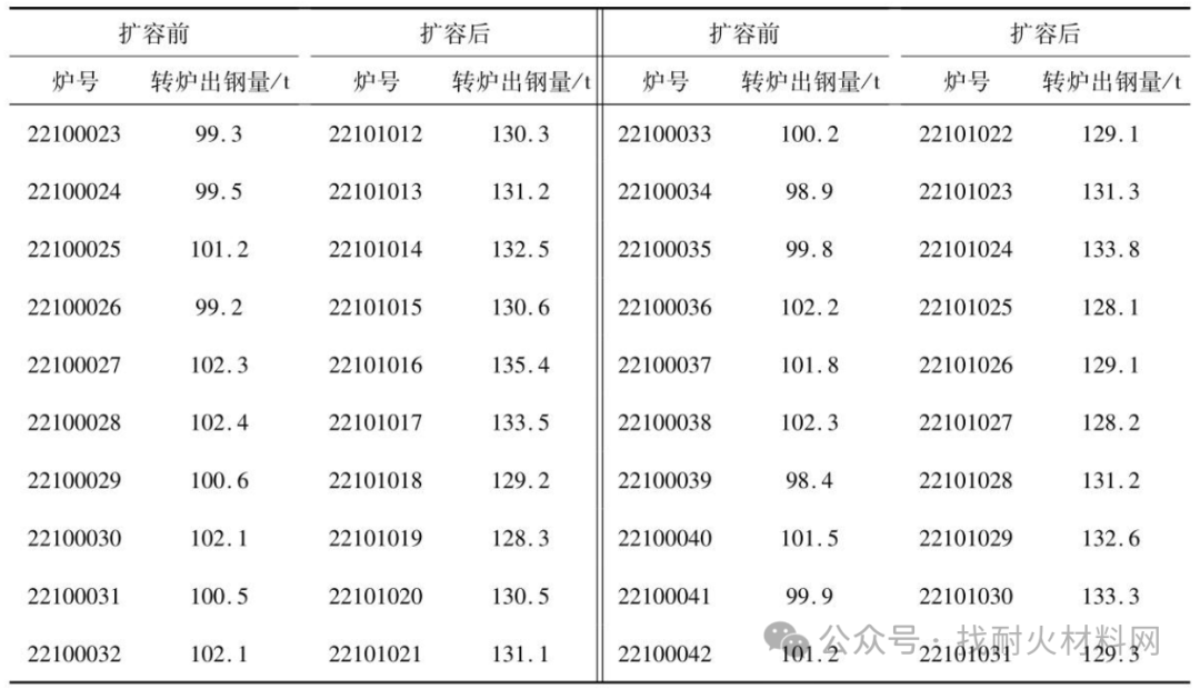 表2为钢包扩容前、后各20炉的转炉出钢量。从表2中可以看出通过钢包修砌工艺的调整改进,扩容前20炉平均转炉出钢量为100.77t,扩容后20炉平均转炉出钢量为130.93t,平均转炉出钢量较扩容前增加了30t左右,达到了预定目标。