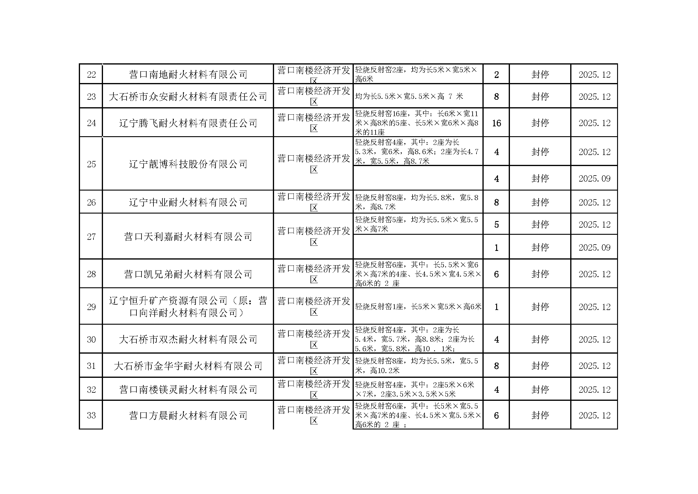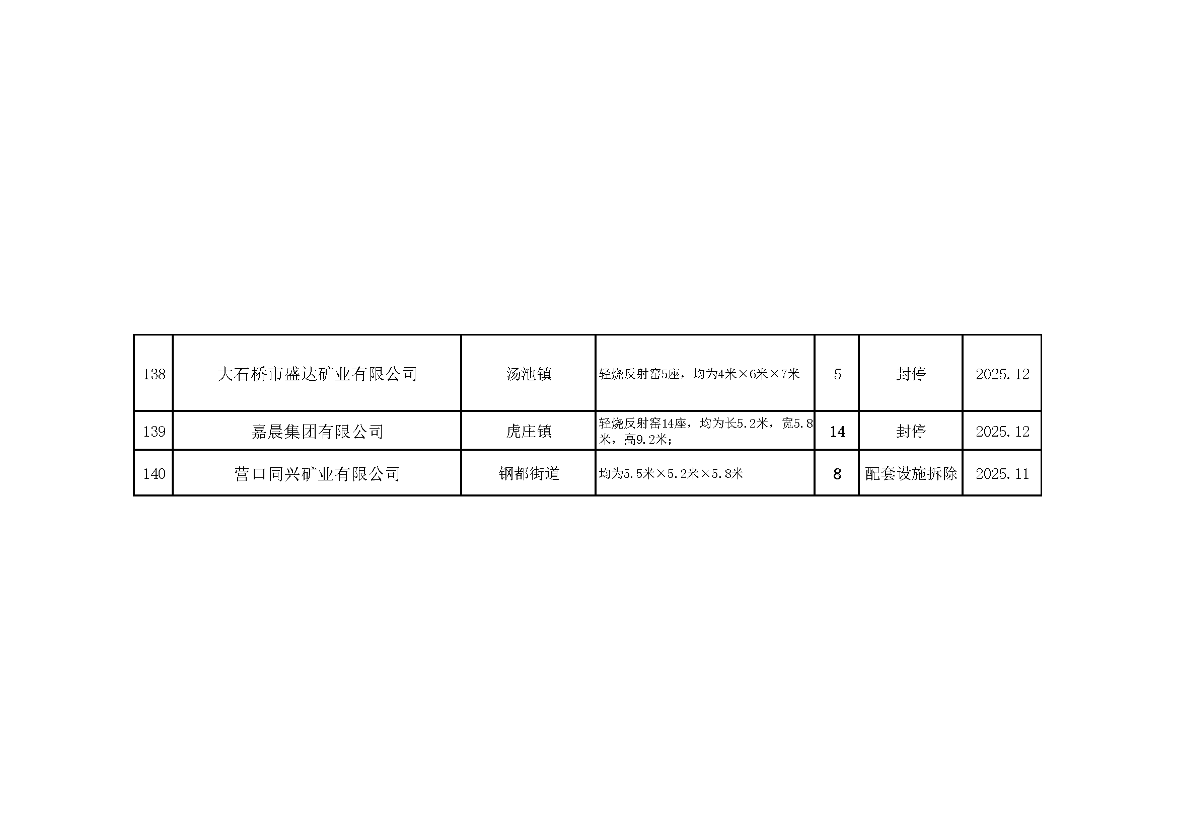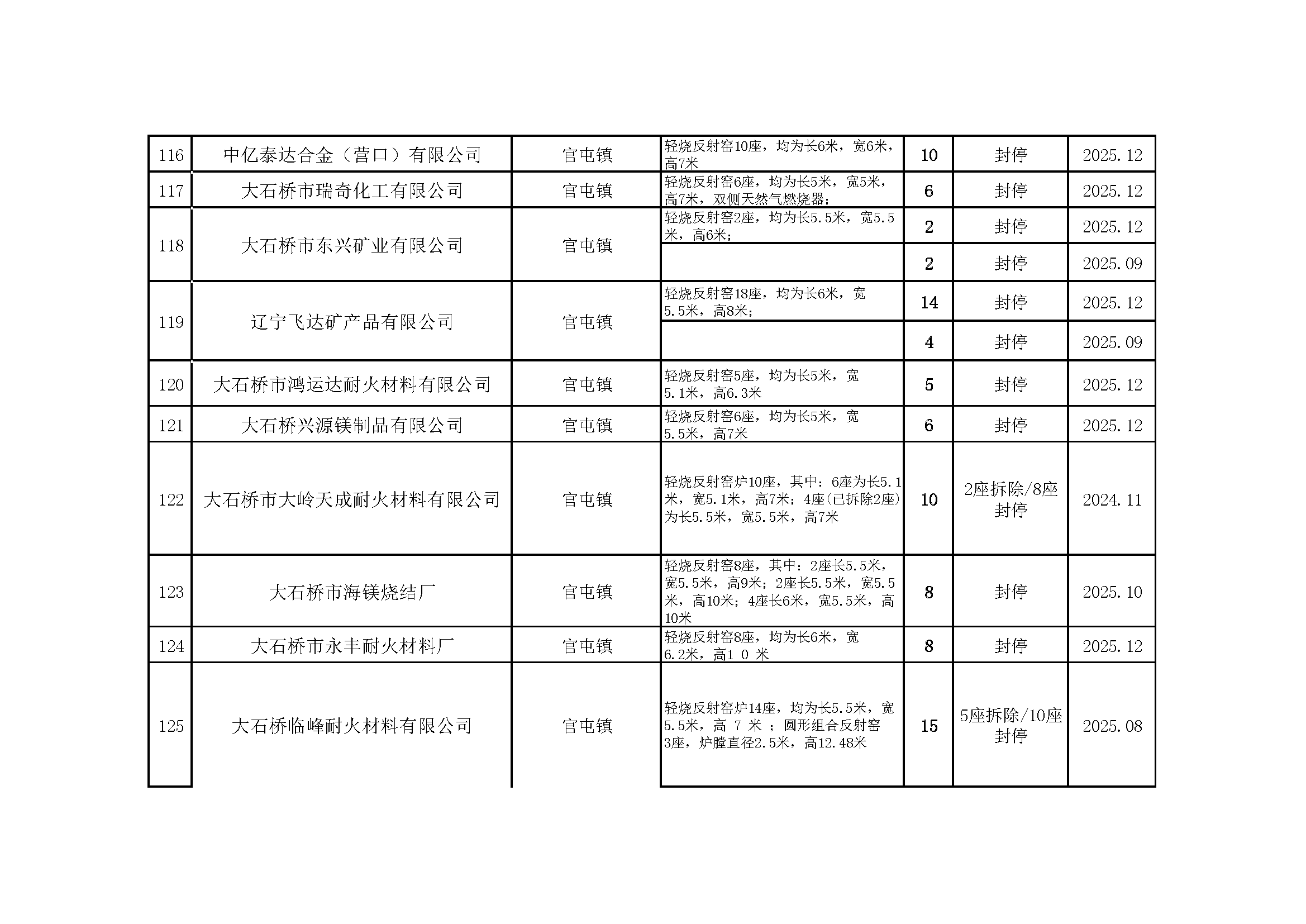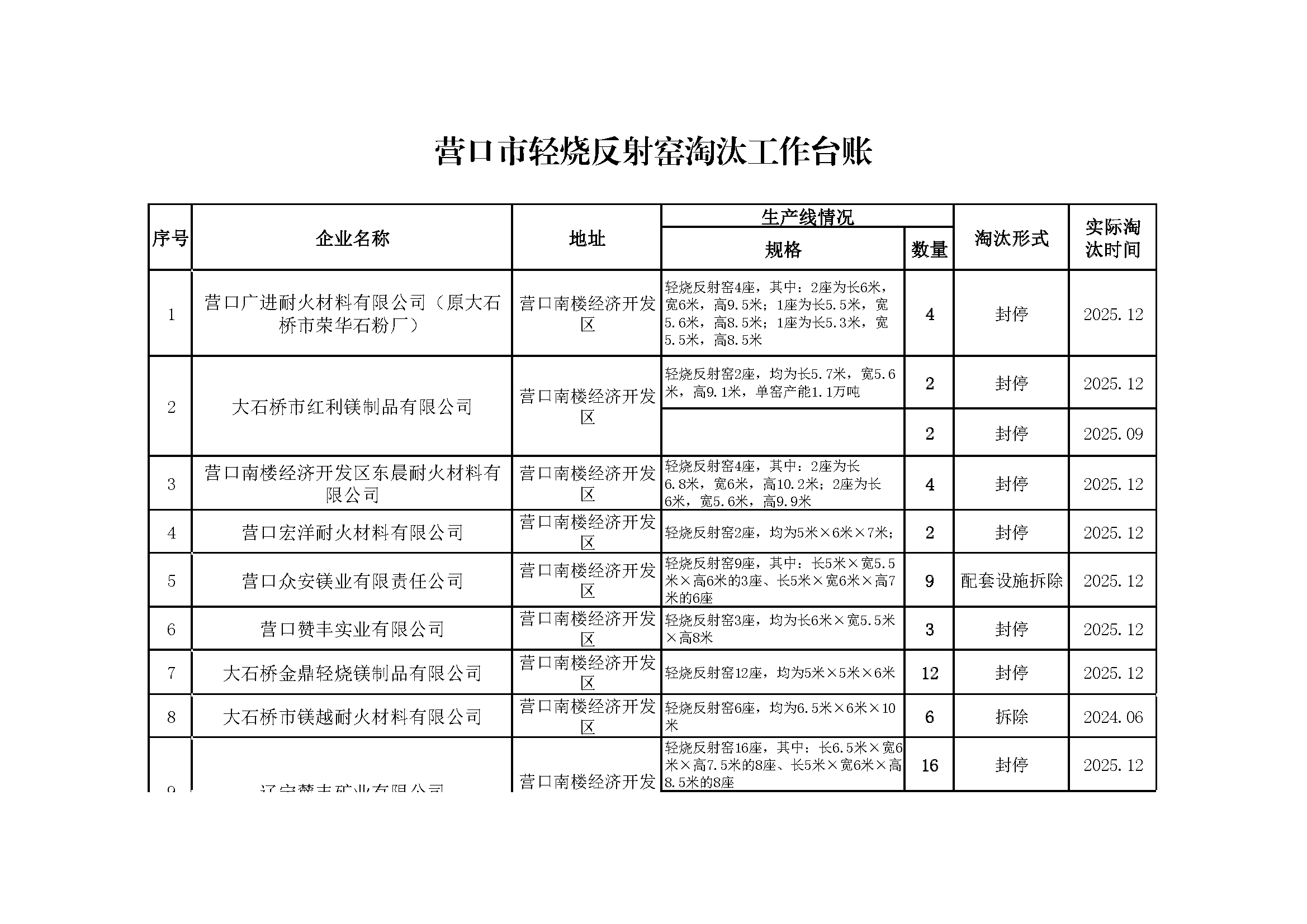 依据《辽宁省人民政府办公厅关于推进菱镁行业高质量发展的实施意见》(辽政办发〔2023〕15号)及《辽宁省轻烧反射窑淘汰工作方案》(辽工信建材〔2024〕18号)要求,我市对辖区内轻烧反射窑开展封停淘汰工作。截至2026年1月31日,全部核验完毕,现将相关淘汰情况予以通告,接受社会监督。企业或个人若对淘汰工作有异议,可如实反映有关情况。