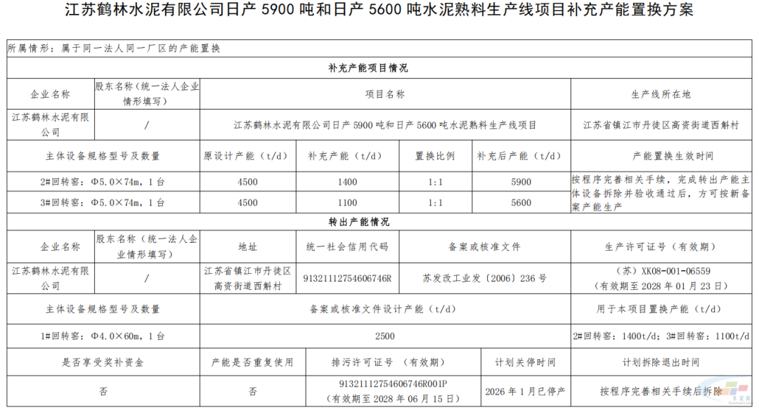 附件:江苏鹤林水泥有限公司日产5900吨和日产5600吨水泥熟料生产线项目补充产能置换方案