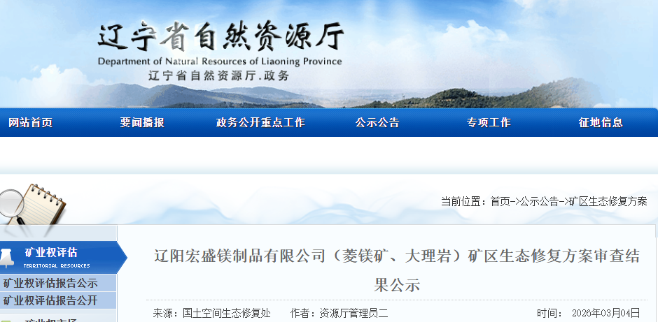 根据《土地复垦条例》和《辽宁省地质环境保护条例》有关要求,我厅委托自然资源事务服务中心组织专家对《辽阳宏盛镁制品有限公司(菱镁矿、大理岩)矿区生态修复方案》进行了审查。现将拟同意通过的该方案及专家评审意见进行公示,公示期自发布之日起5个工作日。