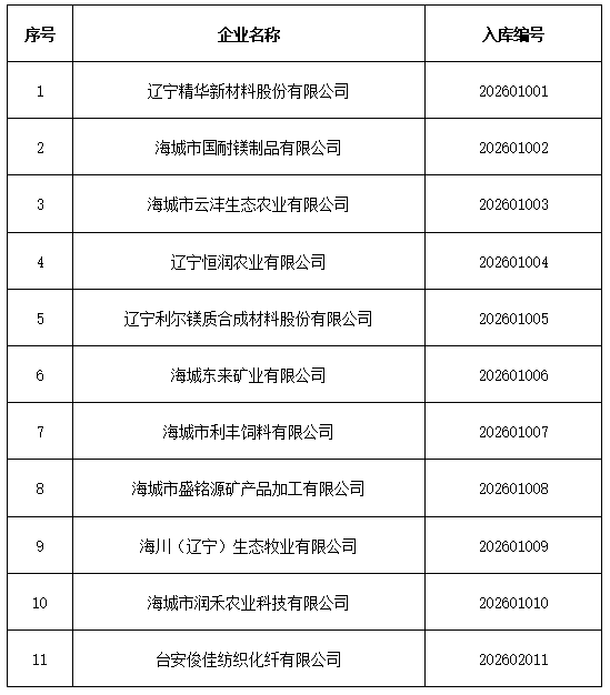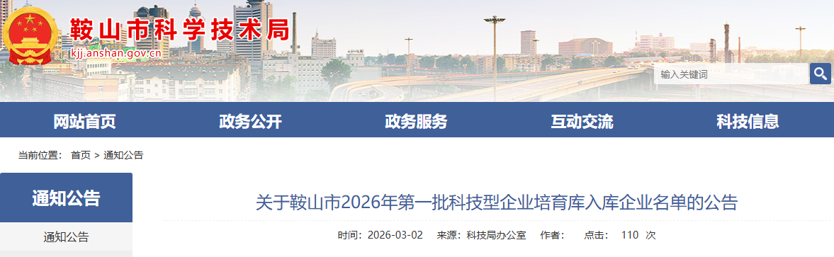 根据《鞍山市科技型企业培育库建设工作行动方案》(鞍科办发〔2026〕1号)有关规定,鞍山市2026年第一批科技型企业培育库拟入库企业于2026年2月24日公示,截止2月28日公示期满。现将公示通过的鞍山市2026年第一批科技型企业培育库入库企业名单(详见附件)予以公告。