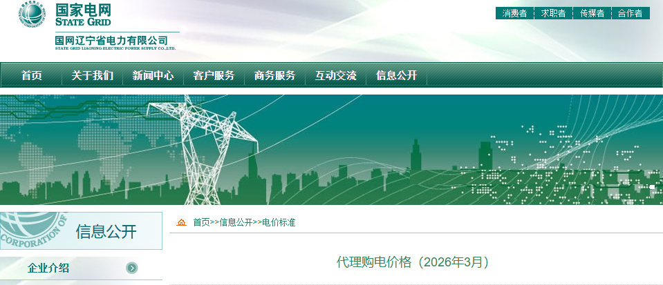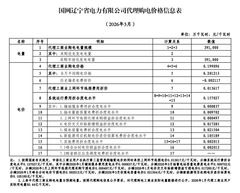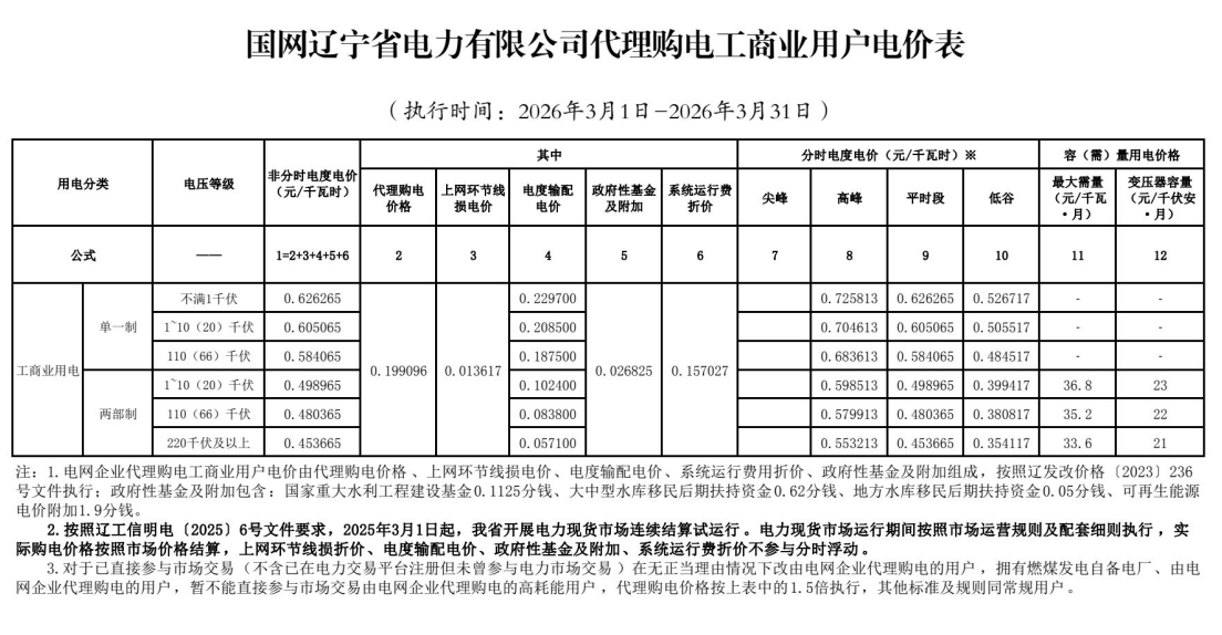 国网辽宁省电力有限公司代理购电工商业用户电价表(2026年3月)
