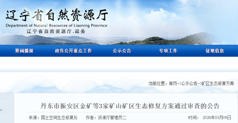 根据《土地复垦条例》和《辽宁省地质环境保护条例》有关要求,丹东市振安区金矿、宽甸智国新军矿业有限公司小汤石硼矿、海城镁矿集团有限公司海城镁矿矿区生态修复方案通过审查,现予公告。
