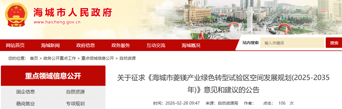 根据市委市政府工作部署,为构建海城高端化、智能化、绿色化的菱镁产业新发展格局,推动海城市由菱镁资源强市向菱镁产业强市转变,自然资源局组织编制了《海城市菱镁产业绿色转型试验区空间发展规划(2025-2035年)》。