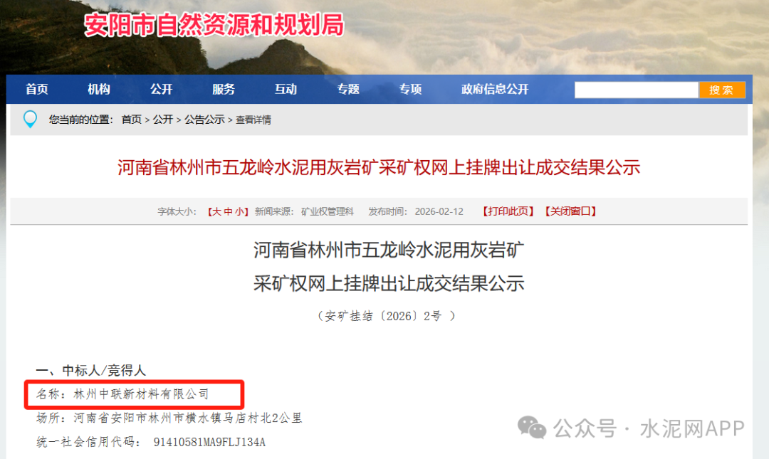 日前,河南安阳市自然资源和规划局发布林州市五龙岭水泥用灰岩矿采矿权挂牌出让成交结果,安阳中联水泥全资子公司林州中联新材料有限公司底价1.67亿元竞得该矿权。