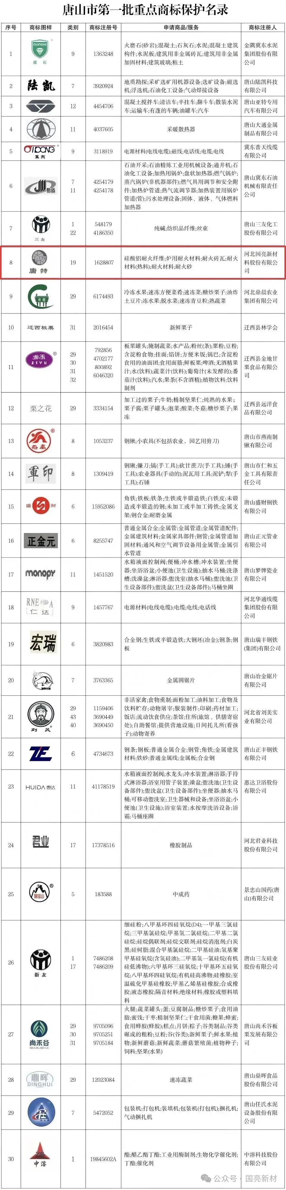 近日,唐山市市场监管局(知识产权局)正式发布《唐山市第一批重点商标保护名录》,河北国亮新材料股份有限公司(简称“国亮新材”)的“唐特”商标凭借深厚的品牌底蕴、突出的市场影响力及完善的商标保护体系,成功入选该名录,标志着公司在品牌保护与知识产权战略层面获重要权威认可。