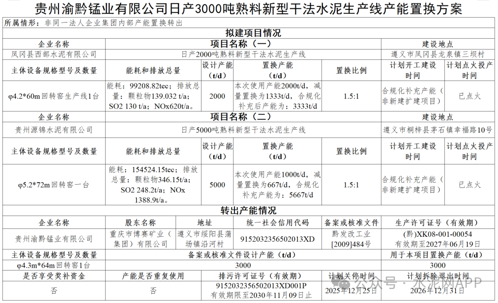 置换方案显示,贵州渝黔锰业有限公司退出一条3000t/d熟料生产线,其中2000t/d产能用于补充凤冈县西部水泥有限公司一条2000t/d熟料线,补齐后产能3333t/d,剩余1000t/d产能用于补充贵州源锦水泥有限公司一条5000t/d熟料线,补齐后产能5667t/d,置换比例均为1.5:1。