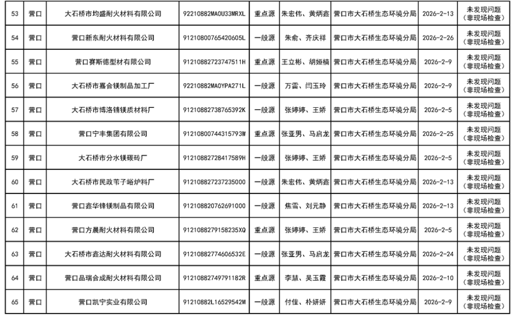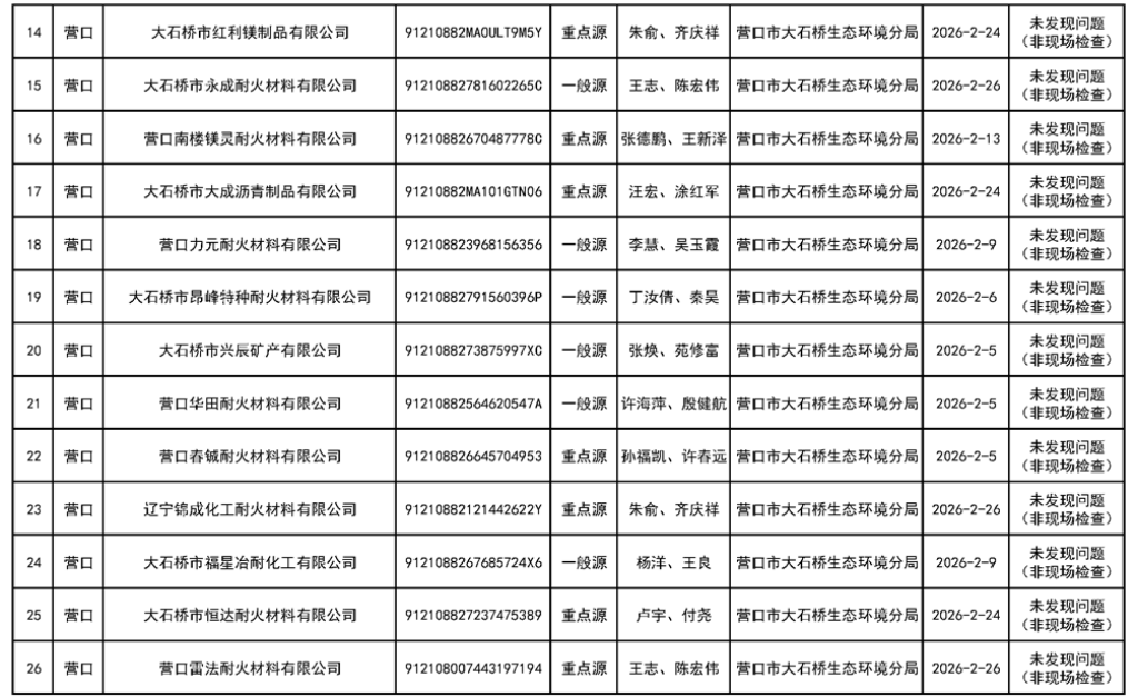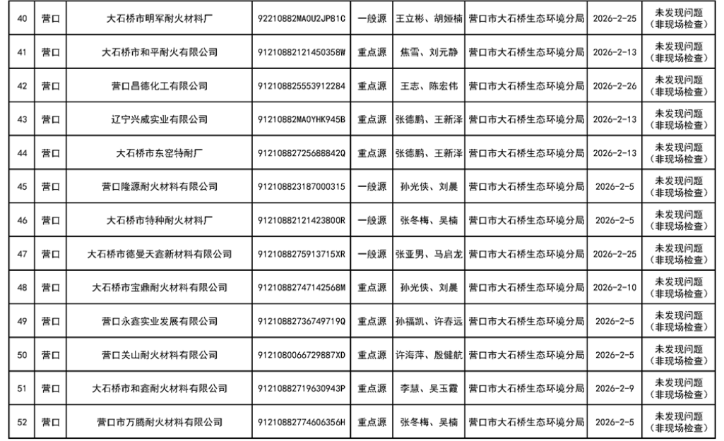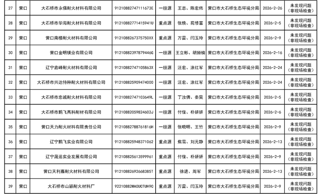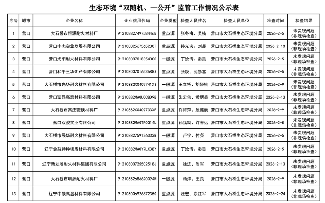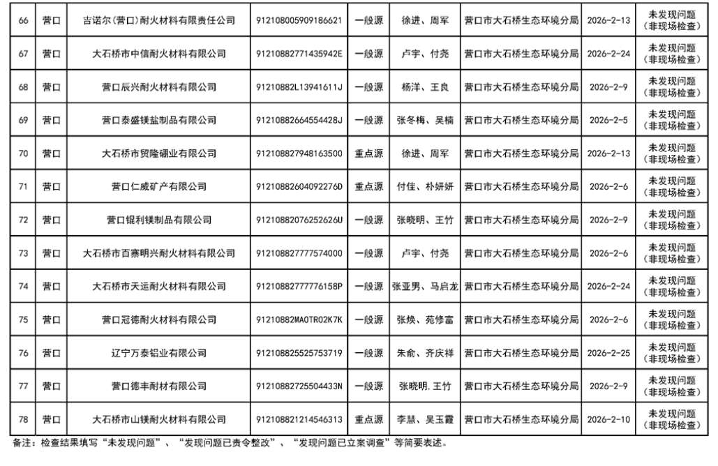 营口市生态环境局公示对大石桥恒源耐火、丰杰实业、光阳耐火等78家企业“双随机、一公开”监管工作情况