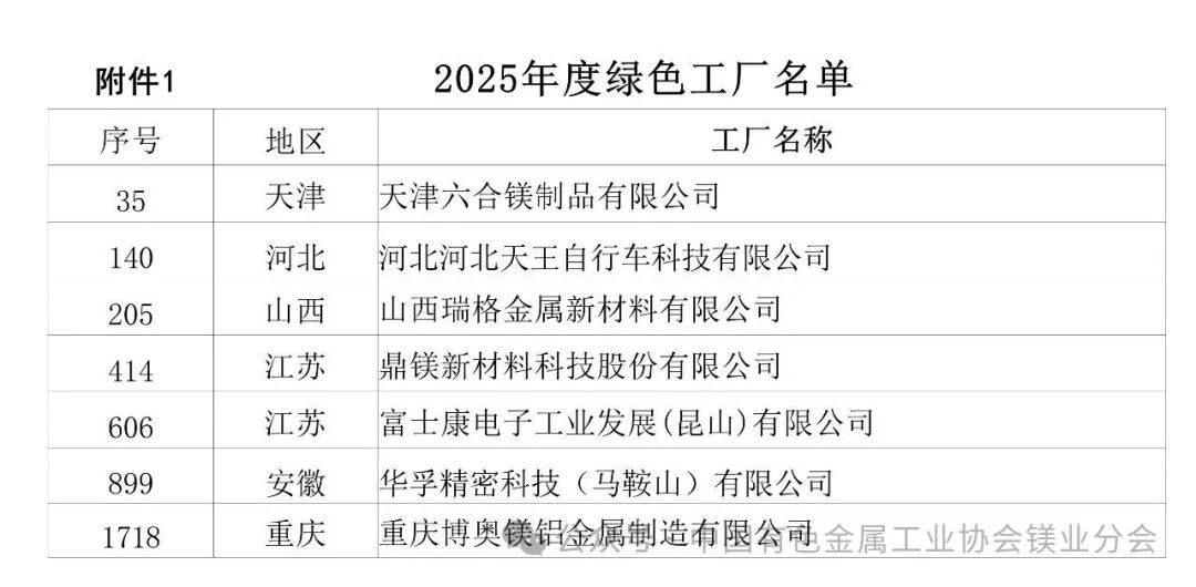 工业和信息化部近日公布2025年度绿色工厂、绿色工业园区名单,包括新培育绿色工厂2038家、绿色工业园区128家。按照动态管理要求,经各地工业和信息化主管部门核实,工业和信息化部将此前发布的132家绿色工厂、3家绿色工业园区移出名单,92家绿色工厂、12家绿色工业园区变更名称。多家镁企上榜。名单如下: