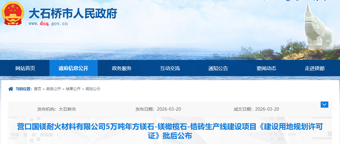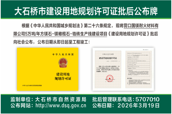 营口国镁耐火材料有限公司5万吨年方镁石-镁橄榄石-锆砖生产线建设项目《建设用地规划许可证》批后公布