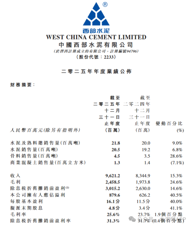 3月24日,西部水泥发布2025年年度业绩,公司实现营业收入96.21亿元,同比增长15.3%;股东应占溢利(归母净利润)8.8亿元,同比增长40.5%。于报告期内,水泥及熟料的销量同比增加9.0%至2180万吨(2024年:2000万吨)。其中,中国市场的销量下降18.8%至1300万吨(2024年:1600万吨),而海外市场的销量则增加120%至880万吨(2024年:400万吨)。