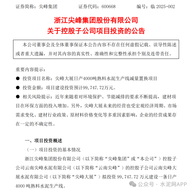 据尖峰集团2025年1月公告显示,公司控股子公司云南尖峰的控股子公司尖峰大展拟投资9.97亿元建设一条日产4000吨熟料水泥生产线。项目投产后,预计年熟料产能124万吨,年新增营业收入约4亿元,投资回收期约8.79年(含建设期),投资内部收益率约11.45%。