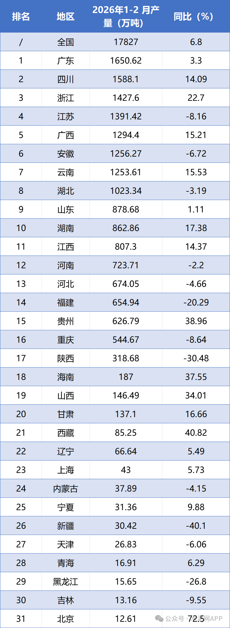 地区数据来看,1-2月,广东以产量1650.62万吨位列第一,四川产量1588.10万吨排在第二,浙江产量1427.60万吨排在第三。