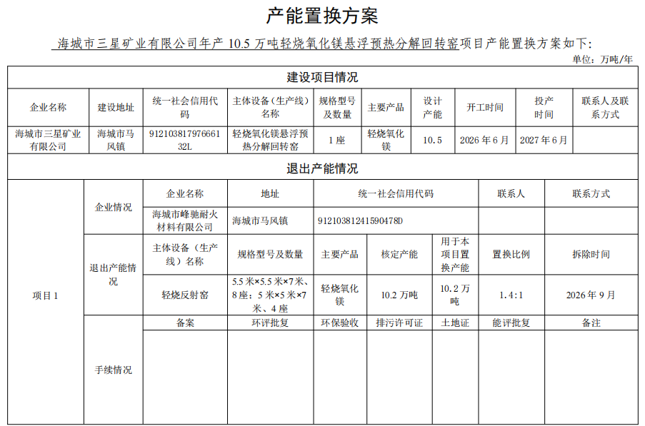 2.海城市中进镁砂厂产能置换方案