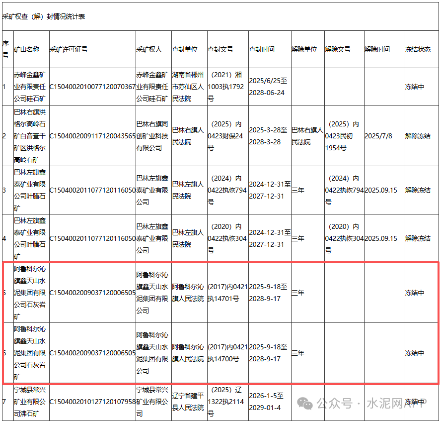 其中,阿鲁科尔沁旗鑫天山水泥集团有限公司石灰岩矿被阿鲁科尔沁旗人民法院查封,查封时间三年,为2025-9-18至2028-9-17。