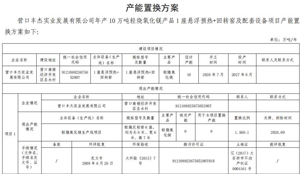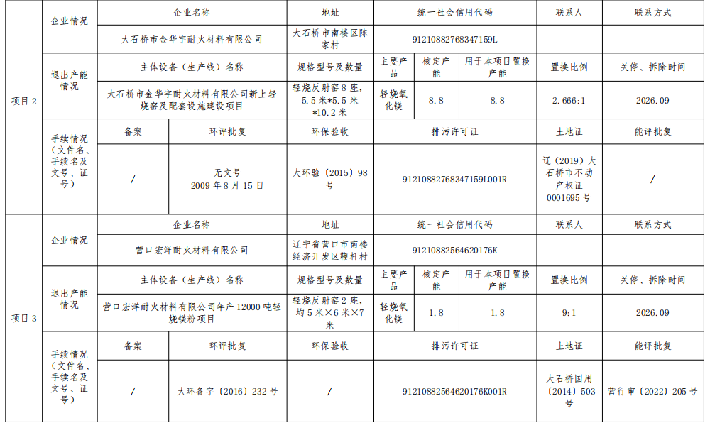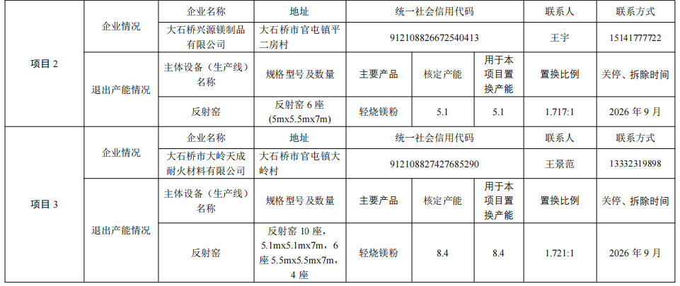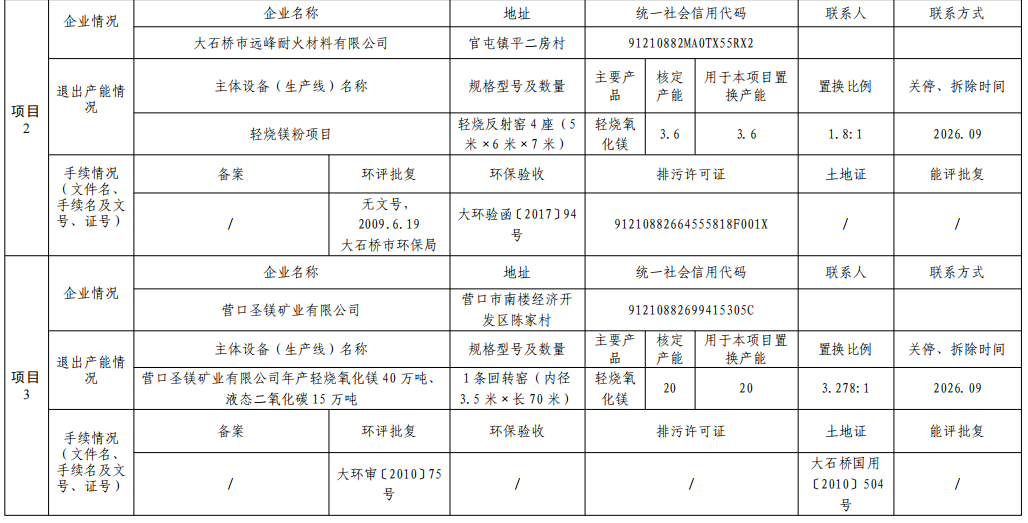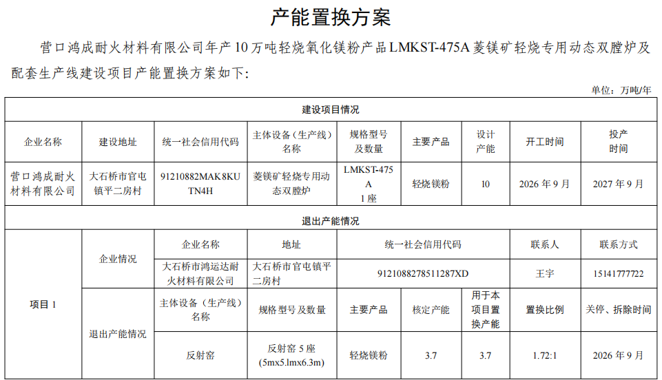 我厅2025年1月15日《关于营口关山耐火材料有限公司等企业新建轻烧氧化镁项目产能置换方案的公告》中大石桥市鸿运达耐火材料有限公司产能置换方案,2026年3月3日《关于营口双骏实业有限公司等8户企业新建轻烧氧化镁项目产能置换方案的通告》中营口双骏实业有限公司产能置换方案、营口希尔实业发展有限公司产能置换方案拟撤销。